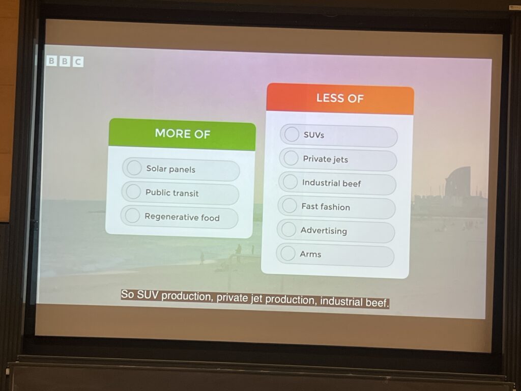 Merjaa puhutteli erityisesti viestintään liittyvät esitykset. BBC:lle degrowthista dokumentin tehnyt ohjaaja Alvaro Alvarez kertoi tuotantoprosessista, ja ekonomisti Katy Shields esitteli podcast-sarjansa Tipping Point, joka avaa vuonna 1972 julkaistun klassikkoteoksen ‘Limits to Growth’ taustoja. Esityksissä painotettiin, kuinka tärkeää on kertoa kohtuutaloudesta ymmärrettävästi ja vaikuttavasti laajalle yleisölle.